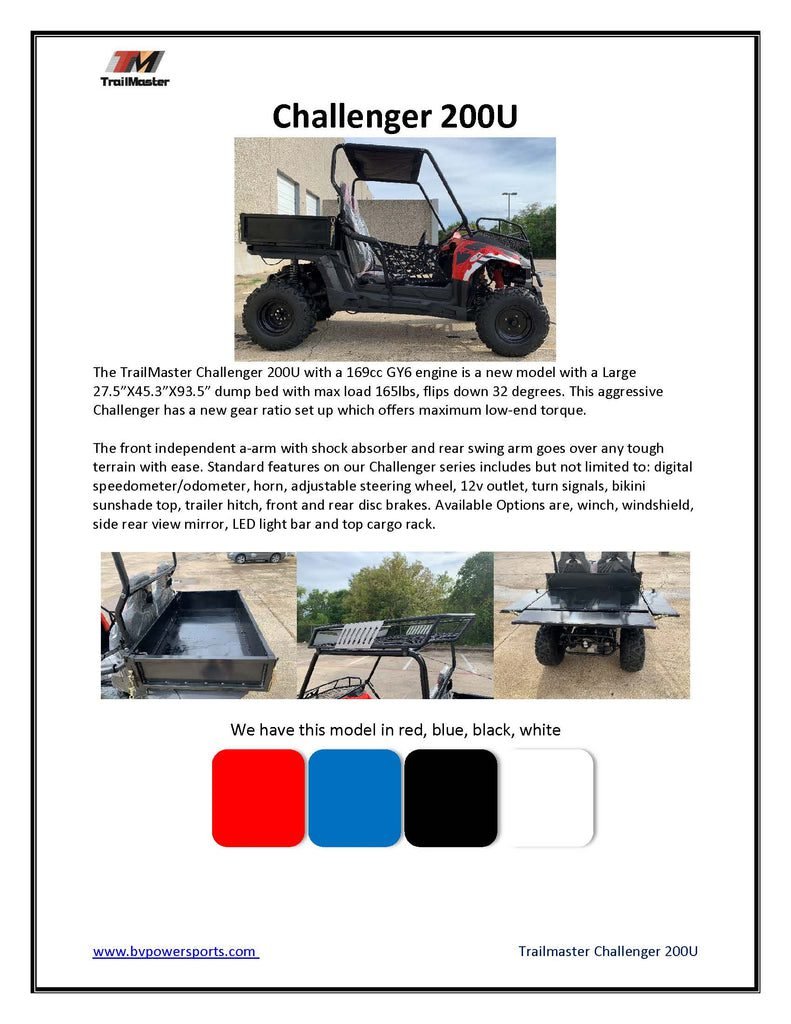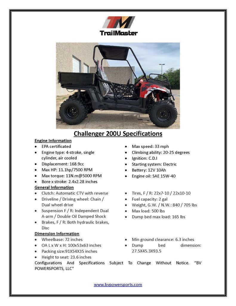 TrailMaster Challenger 200U UTV, 168.9cc Engine, Automatic CVT with Reverse, 4-Stroke Single Cylinder, Air-Cooled, Electric Start