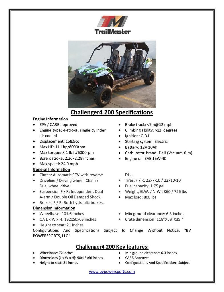 The Challenger4 200 runs on a 168cc GY6 electric start 4-stroke engine. It features an automatic CVT transmission and chain-driven dual rear-wheel drive. The 4-wheel hydraulic assist disc brakes offer secure stopping. The full suspension system and all-terrain tires make trail riding a breeze.