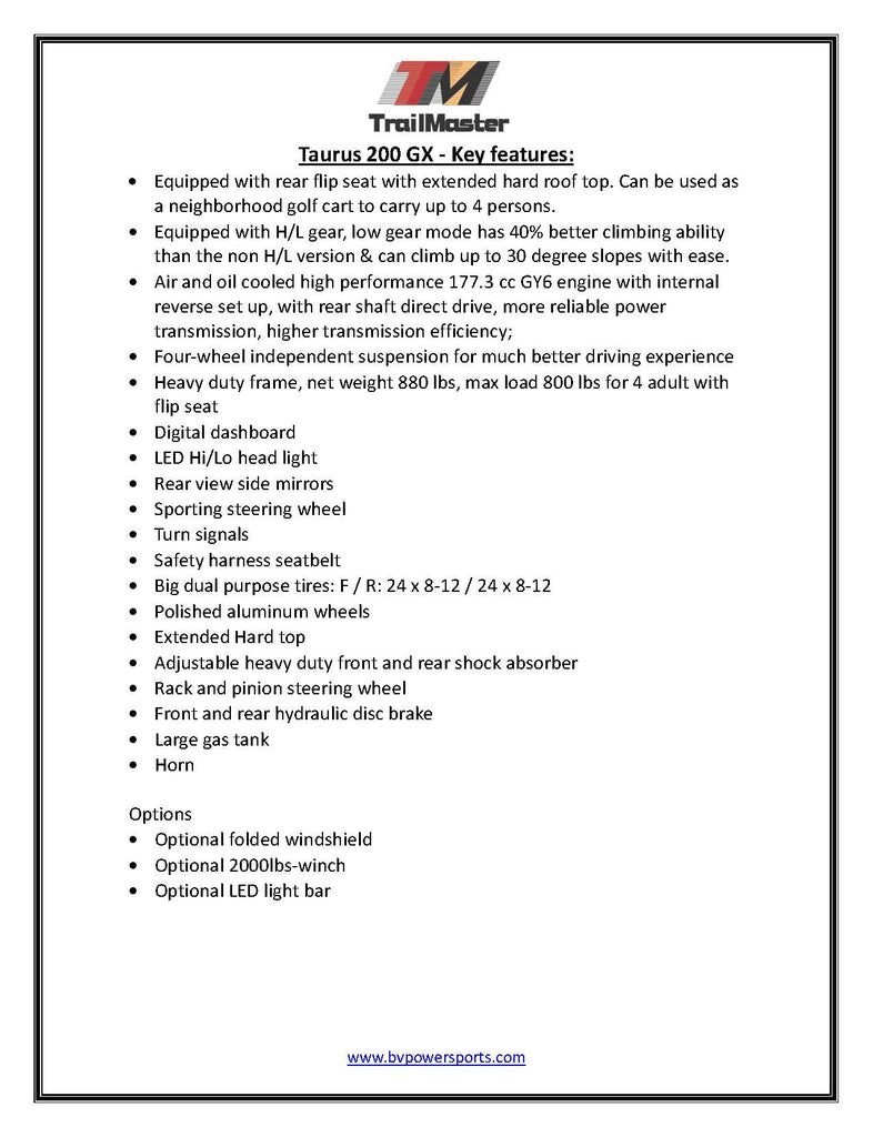 The Taurus 200GX features a 9.5 HP, 177cc GY6 engine, which is both air and oil cooled for enhanced durability. It is equipped with an internal reverse setup, making it more versatile. The vehicle also comes standard with a H/L gear for improved performance. Notably, the low gear mode provides a 40% better climbing ability compared to non-H/L versions, enabling it to easily ascend 30-degree slopes. This feature gives the Taurus 200GX significantly more torque than its non-H/L gear counterparts, ensuring a powerful ride.