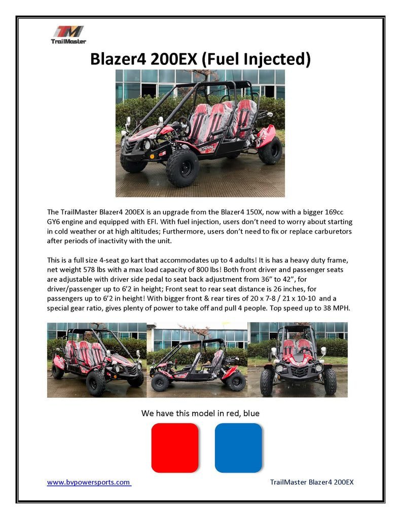 Introducing the TrailMaster Blazer4 200EX, an upgraded version of the Blazer4 150X. Now featuring a larger 169cc GY6 engine with EFI, this model offers enhanced performance. With fuel injection, you no longer have to worry about starting in cold weather or at high altitudes. Furthermore, there is no need to fix or replace carburetors after periods of inactivity, making it highly convenient for users.