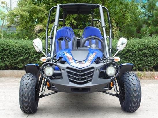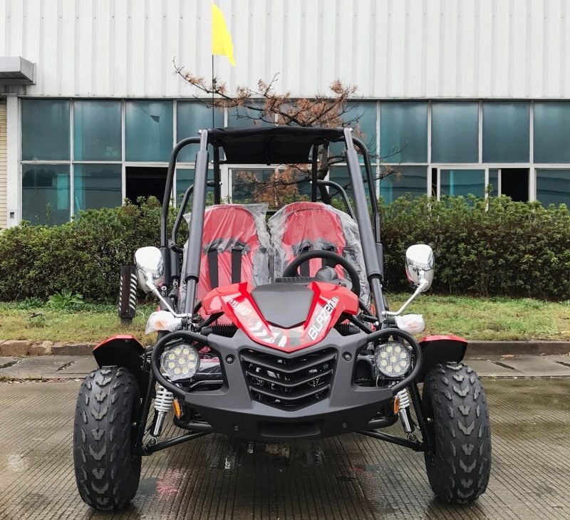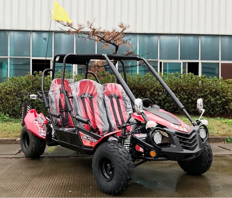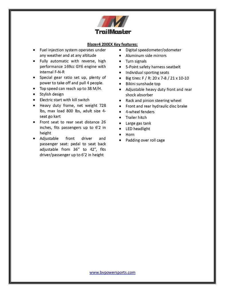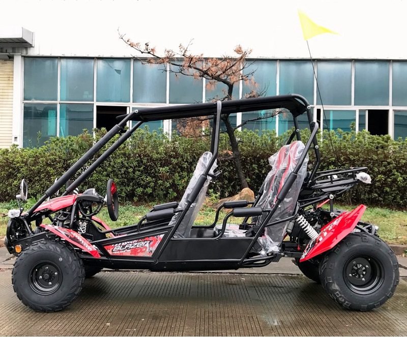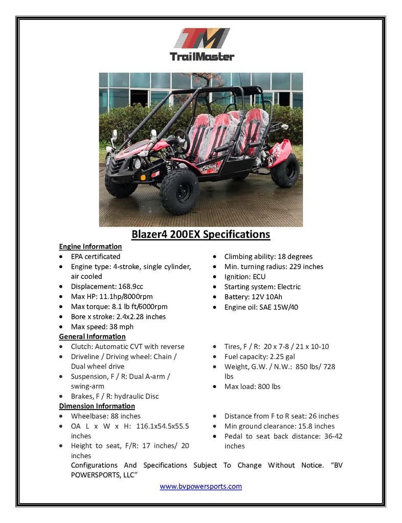 The Blazer4 200EX is a full-size, 4-seat go-kart that comfortably accommodates up to 4 adults. It boasts a heavy-duty frame with a net weight of 578 lbs and a maximum load capacity of 800 lbs. Both the front driver and passenger seats are adjustable, with the driver-side pedal-to-seat-back adjustment ranging from 36″ to 42″, making it suitable for drivers up to 6’2” tall. Moreover, the front-to-rear seat distance is 26 inches, providing ample room for rear passengers, also up to 6’2” in height.